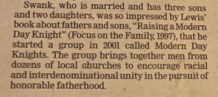 Lee's life was shaped by his father legendary coach Roger Swank. He was also greatly influenced by the lives and ministries of fellow youth workers, Jeff Honson, Dwight Dally, Rusty Lyons, NFL great Tom Landry, Hall of Famer Mike Singletary of the Chicago Bears and world renown author and speaker Robert Lewis. Landry was very active in Fellowship of Christian Athletes, Singletary was active with Bill Glass Prison Ministries. Lee had the honor of doing counseling at Stateville Maximum Security Prison at that time. Lee also shared the stage with Robert Lewis and Raleigh Washington during Lee's years of ministry to men. Lewis is the author of many resources including Raising a Modern Day Knight and The Quest for Authentic Manhood. Dr. Raleigh Washington at the time was Vice-President of the Promise Keepers worldwide men's ministry.